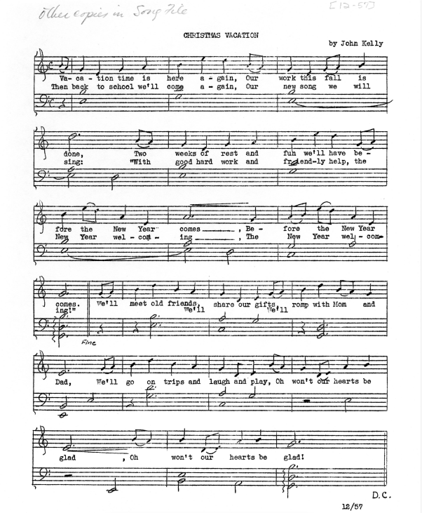 Sheet music for the song, "Christmas Vacation", written by John Kelly, December 1957. -