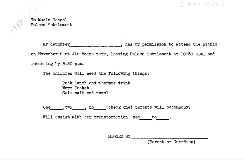 Permission slip for parents to allow their daughter to attend the picnic at Ala Moana Beach Park, November 1958. -