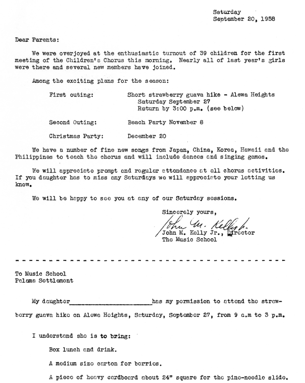 Letter from John M. Kelly, Jr. to parents regarding excursion plans for the season with a permission slip for parents to send their daughter to an ʻĀlewa Heights hike, September 20, 1958. -