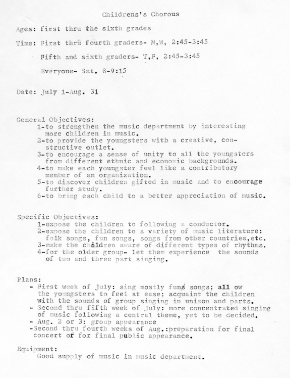 Program objectives and plans of the Children's Chorus outlined by Mary Ann Masuda, July 1 - August 31, 1963.