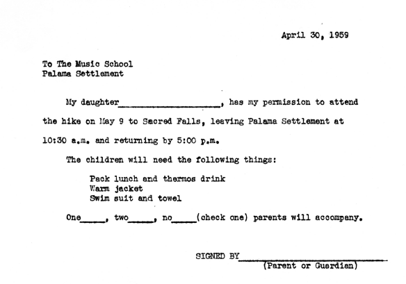 Permission slip to parents allowing their daughter to hike Sacred Falls, April 30, 1959.