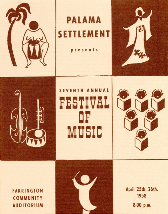 Program for Palama Settlement's Seventh Annual Festival of Music at Farrington Community Auditorium, April 25, 1958. Program lineup: (1) Music and dance of Okinawa, (2) Folk songs of Hawaiʻi and the Pacific nations, (3) Children's hour of old Hawaiʻi featuring Kamokila Campbell, Pele Pukui, Kaʻupena Wong, (4) Friendship House, (5) Roosevelt High School a cappella choir, (6) McKinley High School concert band. -