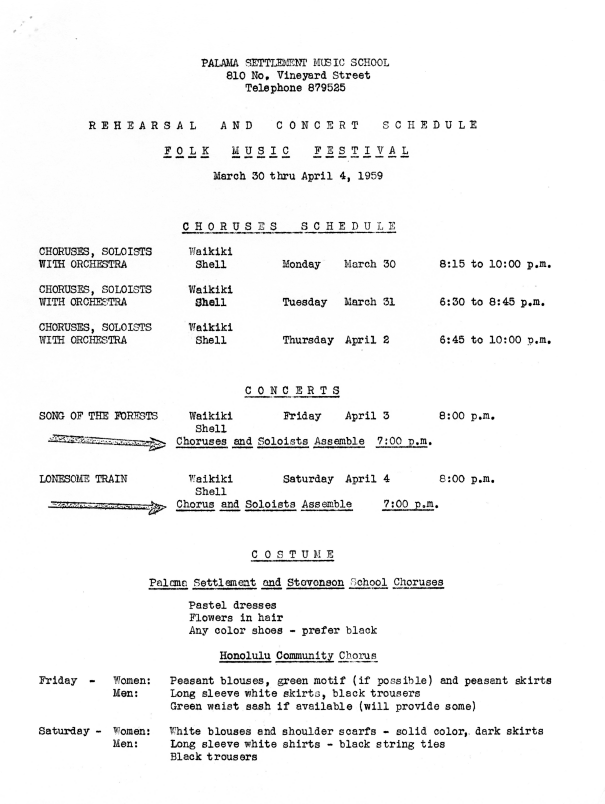 Letter to parents regarding the chorus and concert schedules for the Folk Music Festival from March 30 to April 4, 1959.