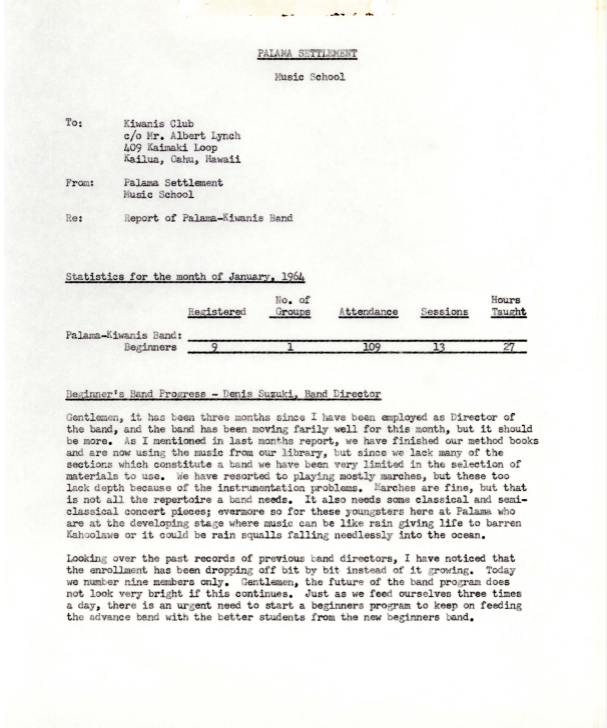 Correspondence to Kiwanis Club from Palama Settlement Music School about statistics report for the month of January 1964 and Beginner's progress report, January 1964.