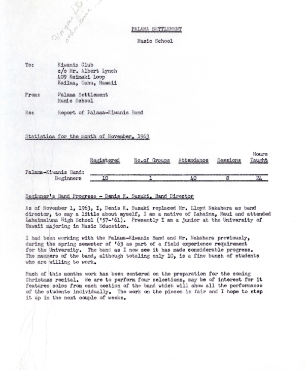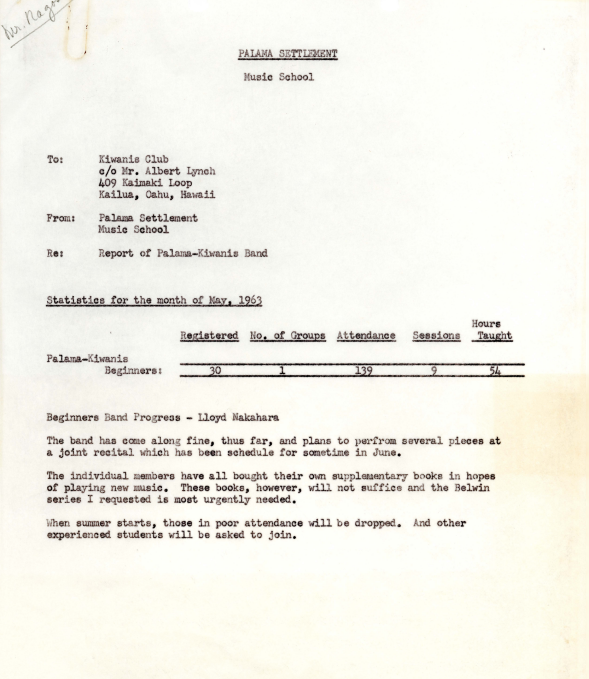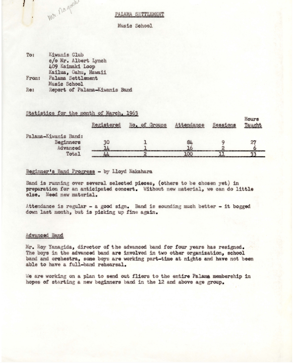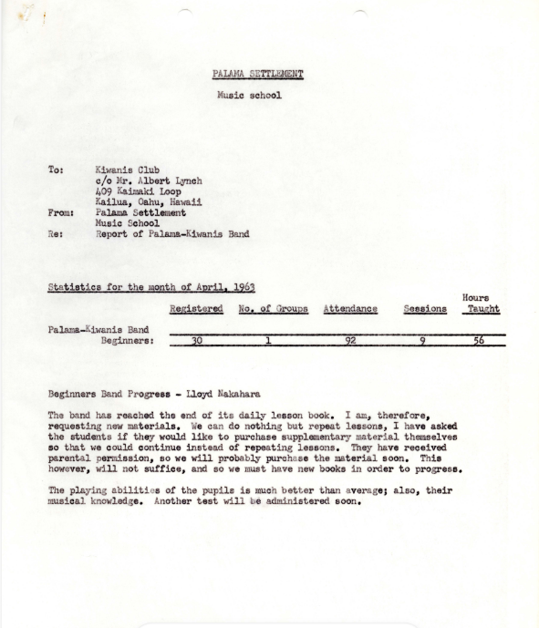 Correspondence to Kiwanis Club from Palama Settlement Music School about statistics report for the month of March 1963 and Beginner's and Advance Band Progress report, March 1963.