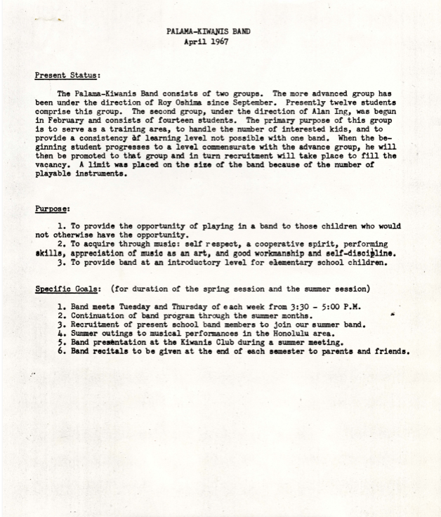 Palama-Kiwanis Band consists of two groups the advance band under Roy Oshima since September. The second group serves as a training area which began in February with fourteen students under Alan Ing, April 1967.