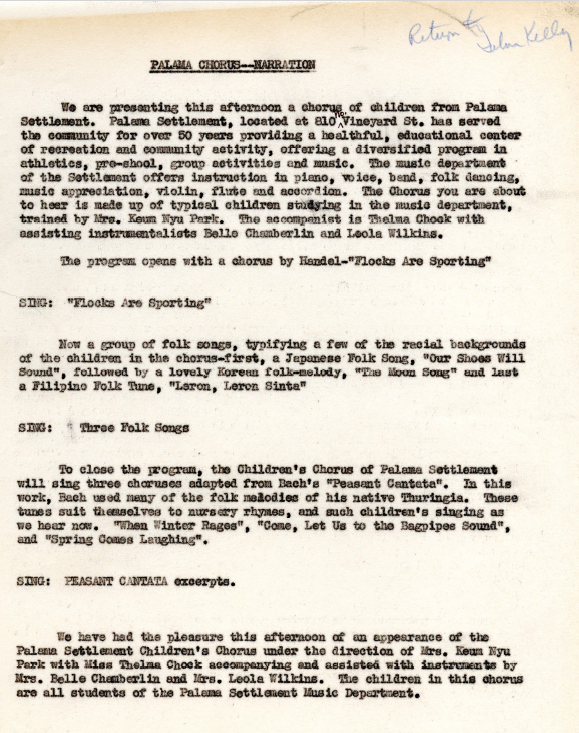 Narration script for the Palama Chorus event under the direction of Mrs. Keum Nyu Park accompanied by Thelma Chock, Belle Chamberlin, and Leola Wilkins, December 18, 1954.