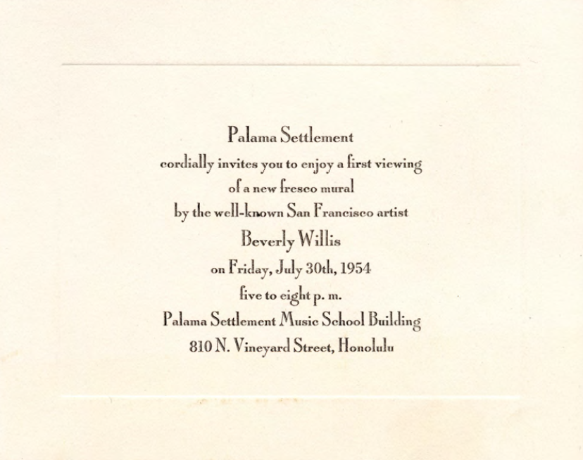 Invitation to the first viewing of a fresco mural by artist Beverly Willis at Palama Settlement Music School Building, July 30, 1954.