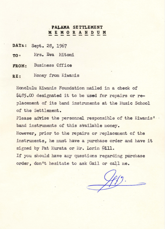 Memorandum to Mrs. Eva Mitomi from Business office informing Palama Settlement Kiwanis Band personnel about Honolulu Kiwanis Foundation check of $485 designated for instrument repairs and replacements. It is advice to provide a purchase order and have it signed by Pat Murata or Mr. Lorin Gill before further action is taken, September 28, 1967.