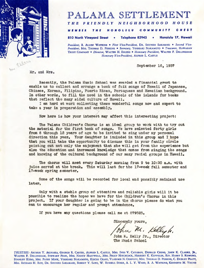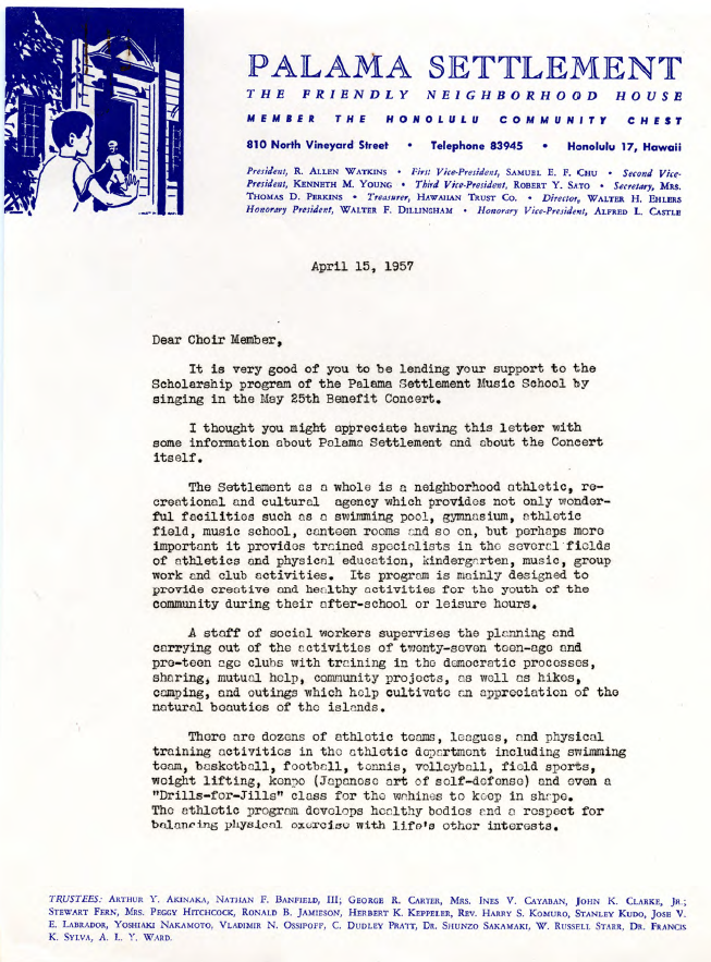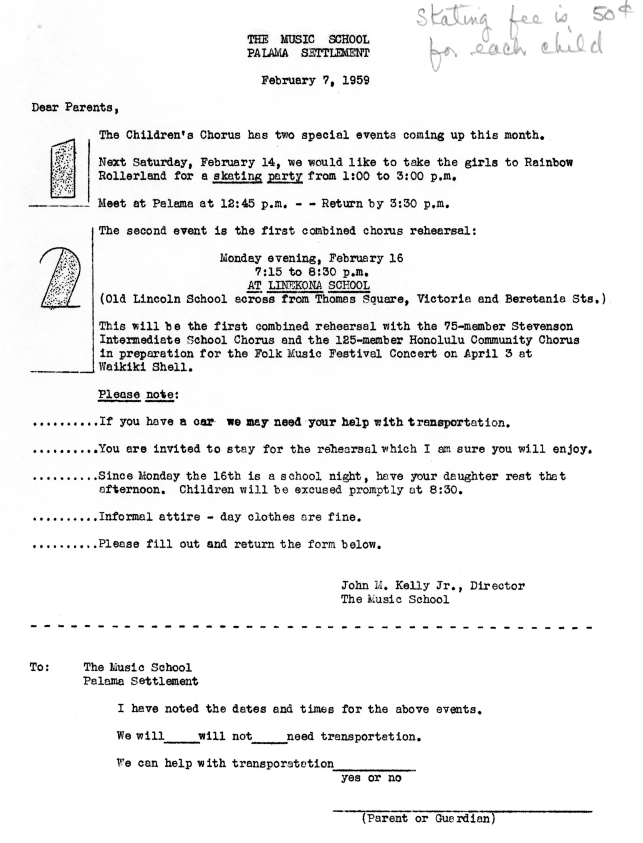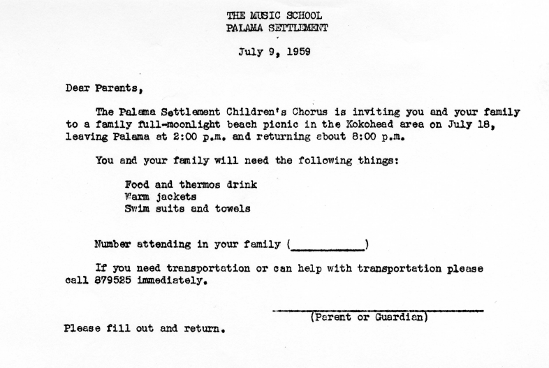 Invitation letter to the parents of the Palama Settlement Children's Chorus to a family full-moonlight beach picnic, July 9, 1959.