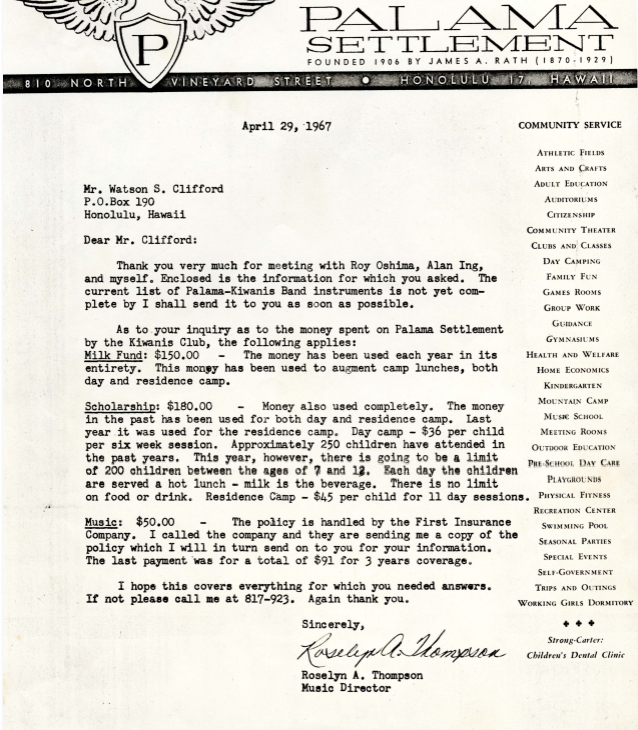 Correspondence to Mr. Watson S. Clifford from Music Director Roselyn A. Thompson regarding Palama-Kiwanis Band current instrument list, that has not been completed yet. As well as report on money spent for the band's expenses such as Milk Fund, Scholarship, and Music, April 29, 1967.