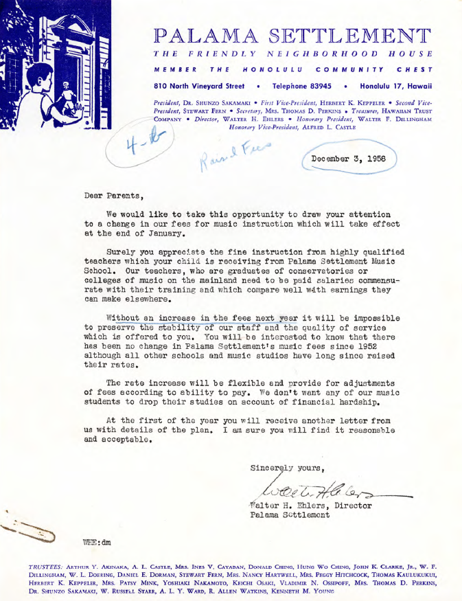 Letter from Walter H. Ehlers to the parents of students enrolled in the music program regarding changes in music instruction fees, December 3, 1958.