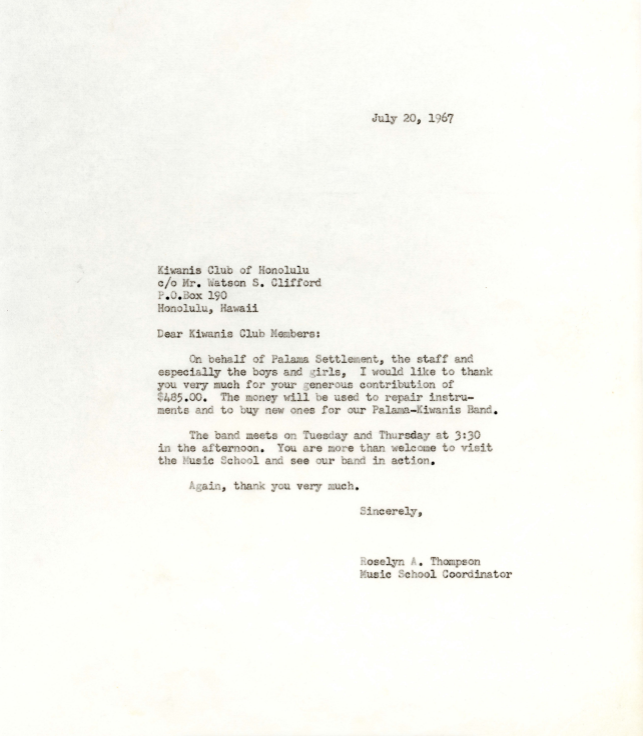 Correspondence to Kiwanis Club Members from Music School Coordinator Roselyn A. Thompson, thanking the bands contribution of $485 which will be used to fund instrument repairs and buy new instruments, July 20, 1967.