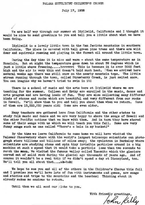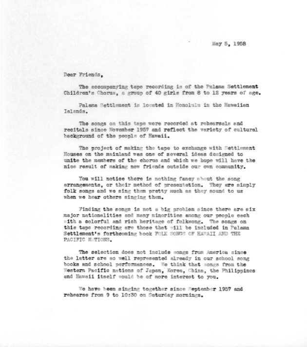 Letter from John M. Kelly, Jr. regarding the recordings of the Palama Settlement Children's Chorus, May 5, 1958. -