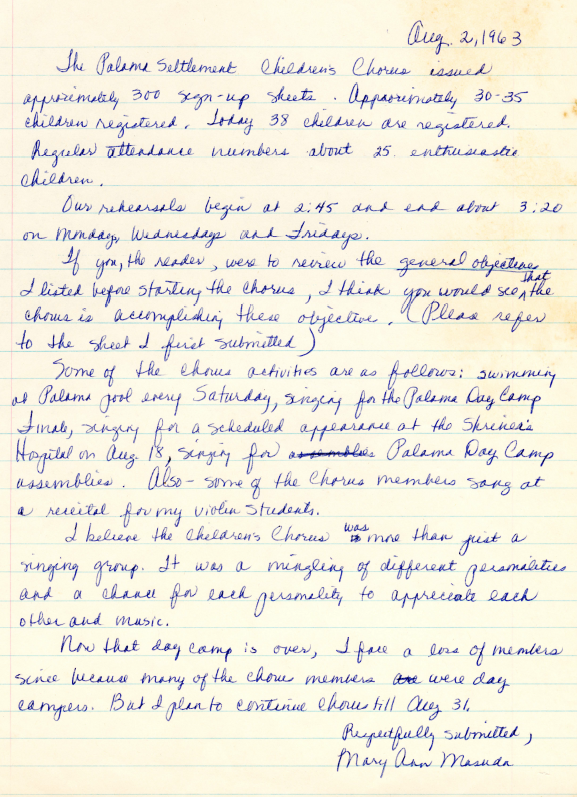Report from Mary Ann Masuda regarding the Children's Chorus, August 2, 1963.