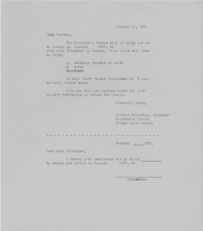 Correspondence to parents from Miss Tolentino about field trip logisitcs and permissions slip, January 19,1957.