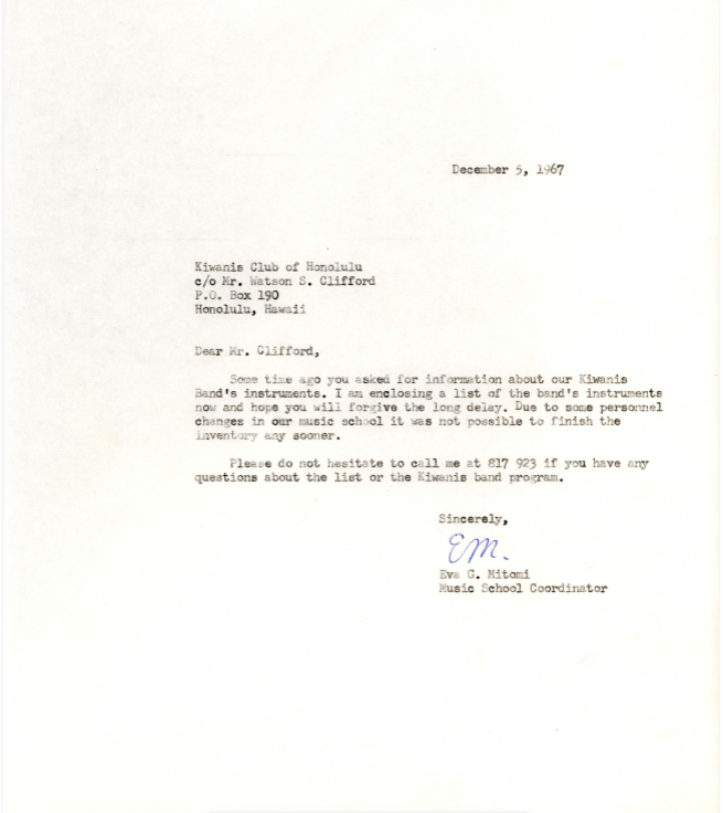 Correspondence to Mr. Clifford from Music School Coordinator Eva G. Mitomi, about the Kiwanis Band's instrument List. Due to personnel changes finishing inventory was not done sooner, December 5, 1967.