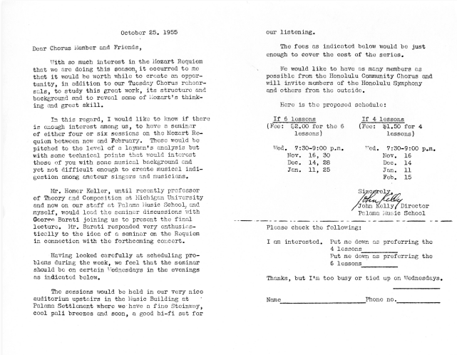 Correspondence to Chorus Member and Friends about Mozart Requiem Seminar led by Mr. Homer Keller, Mr. John Kelly and Mr. Barati, October 25, 1955.