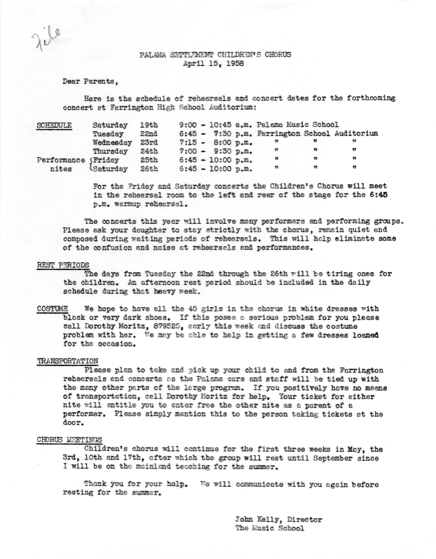 Letter from John Kelly to parents regarding the schedules of rehearsals and concert dates for the forthcoming concert at Farrington High School Auditorium, April 15, 1958. -