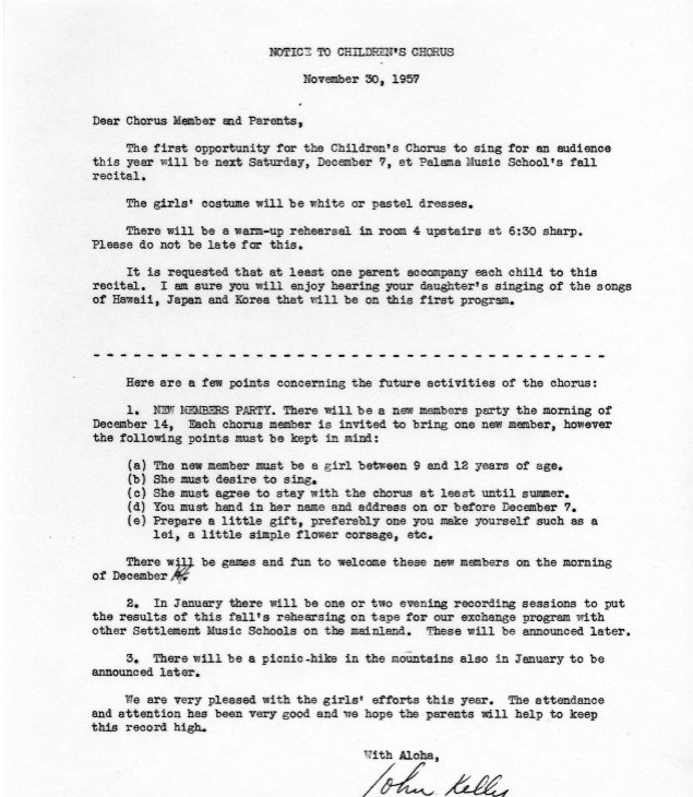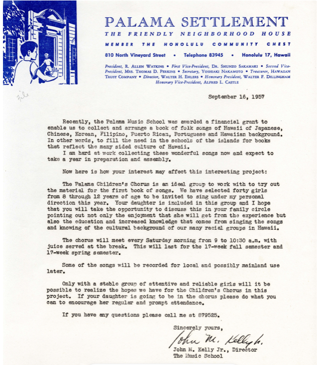 Correspondence to Chorus member from Music School Director John M. Kelly Jr., about Palama Music School being awarded a financial grant. The school is creating a book of folk songs of Hawaii of Japanese, Chinese, Korean, Filipino, Puerto Rican, Portuguese and Hawaiian background. The Palama Children's Chorus has selected forty girls from 8 through 12 years of age to be invited to sing, September 16, 1957.