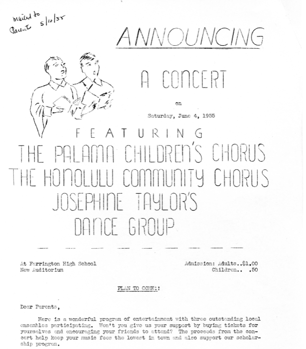 Concert featuring The Palama Children's Chorus, The Honolulu Community Chorus, and Josephine Taylor's Dance group at Farrington High School flyer, June 4, 1955.