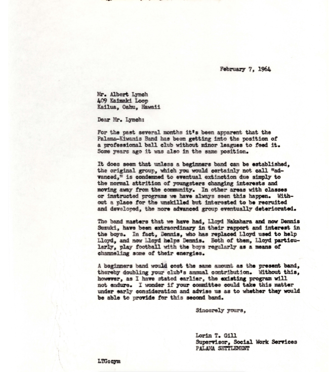 Correspondence to Mr. Albert Lynch from Lorin T. Gill regarding the future of the Palama-Kiwanis Club's second band, February 7, 1964.