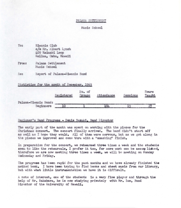 Correspondence to Kiwanis Club from Palama Settlement Music School about statistics report for the month of December 1963 and Beginner's progress report, December 1963.