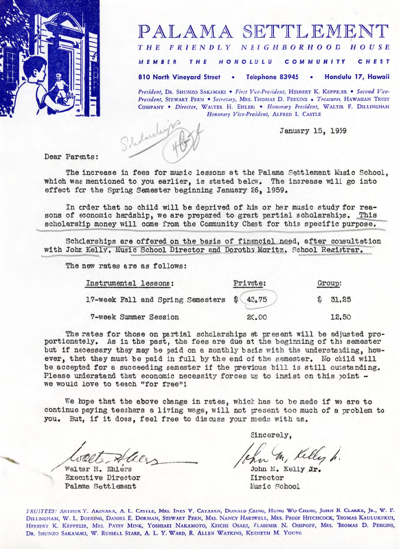 Letter from Walter H. Ehlers and John M. Kelly Jr. addresed to parents regarding fee adjustments for music lessions, January 15, 1959.