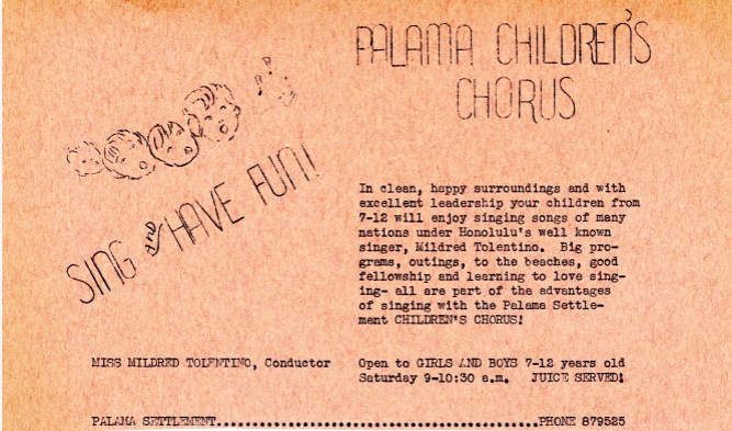 Palama Children's Chorus invites children ages from 7 to 12 to sing songs with well-known singer, Mildred Tolentino, circa 1946-1958.