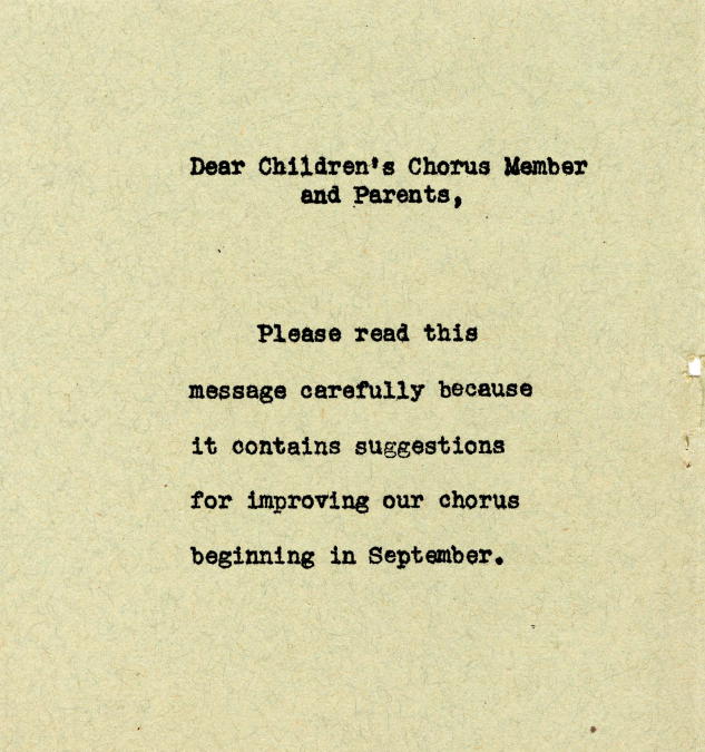 Announcement flyer to Children's Chorus Member and Parents, about what is included in the program and extending the age chorus membership to 14 instead of 13, September 19, 1957.