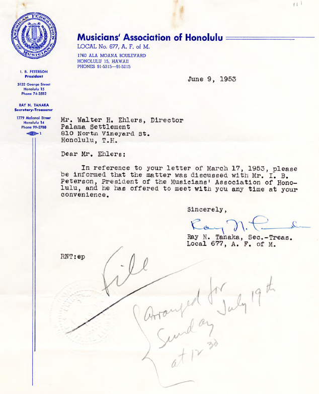 Letter from Ray N. Tanaka, Secretary-Treasuer of Local 677, A.F. of M. to Walter H. Ehlers regarding Musicians' Association of Honololu, June 9, 1953.