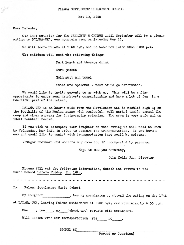 Letter from John Kelly, Jr. to parents with permission slip for a picnic outing to Palama Uka, May 10, 1958. -