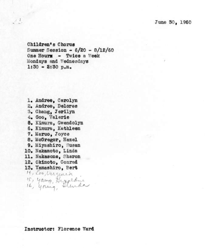 Children's Chorus summer session roster under instructor Florence Ward, June 30, 1960.