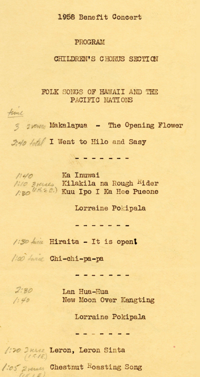 Flyer for for Palama Settlement Music School Children's Chorus, July 1 - August 31, 1963. -