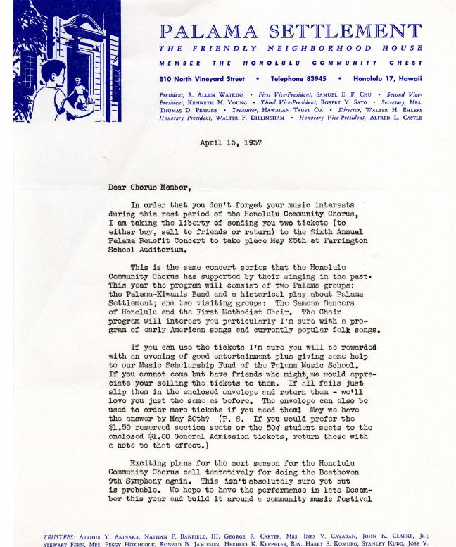 Correspondence to Chorus Member from Music School Director John M. Kelly Jr., inviting member to the Sixth Annual Palama Benefit Concert on May 25th at Farrington School Auditorium, April 15,1957.