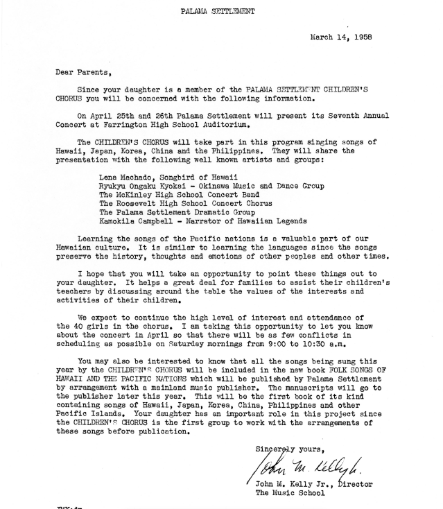Correspondence to Chorus member from Music School Director John M. Kelly, Jr., about Palama Music School being awarded a financial grant, September 16, 1957. The school is creating a book of folk songs of Hawaii of Japanese, Chinese, Korean, Filipino, Puerto Rican, Portuguese and Hawaiian background. The Palama Children's Chorus has selected forty girls from 8 through 12 years of age to be invited to sing, -