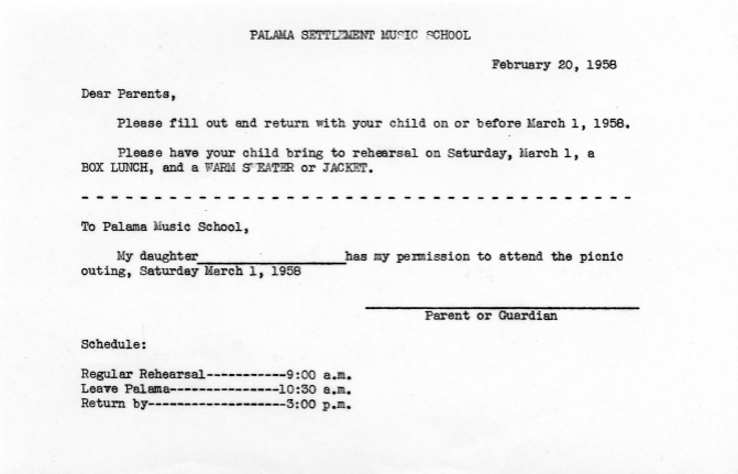 Palama Settlement Music School's notice to parents: return slip before March 1, 1958, and have child bring to rehearsal a box lunch and a warm sweater or jacket, February 20, 1958.