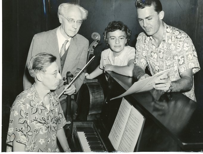 Donald Wiley sits at piano as (l-r) Hugo Kortschak, Belle Shalit, and music school director John Kelly, Jr. plan a benefit concert at First Methodist Church, March 13, 1953.