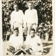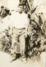 Tennis players John Makolo, Frake, Asam, and Johnny Puuloa posing for photo, 1940-1960. Top Left: John Makolo, Bottom Left: Asam, Top Right: "Frake", Bottom Right: Johnny Puuloa -