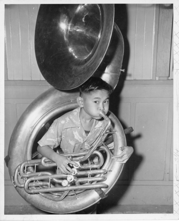 Kenneth Chong plays the sousaphone, 1946.