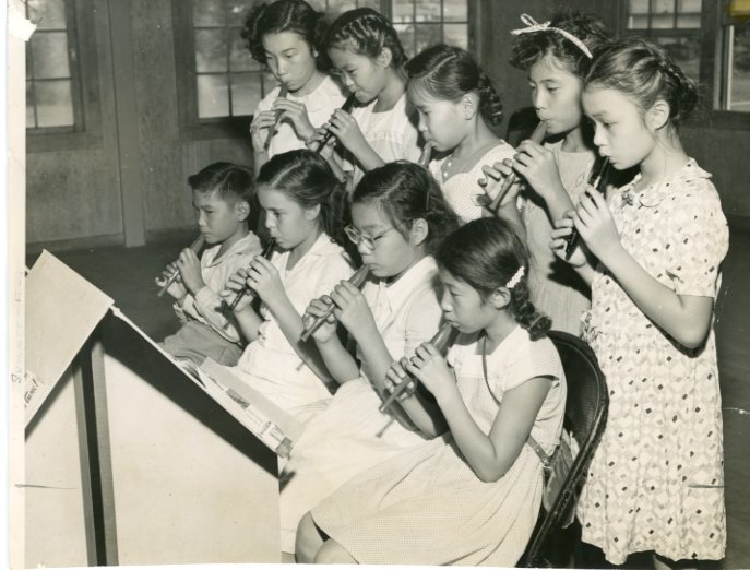 Music students play their recorders, 1946-1949. Left to right - front row - seated students: Kenneth Chong, Lilah Shannon, Evelyn Ho.