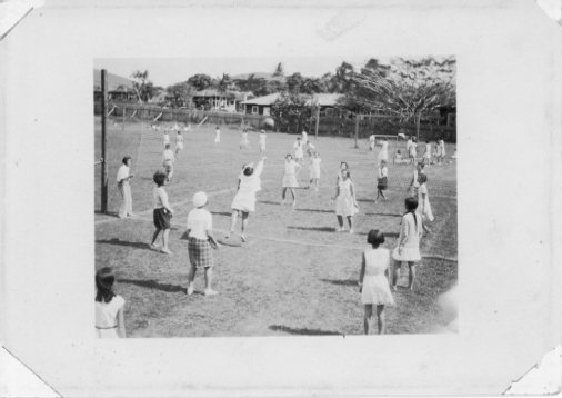 A group of girls playing volleyball at Palama Settlement field, 1945-1960. -