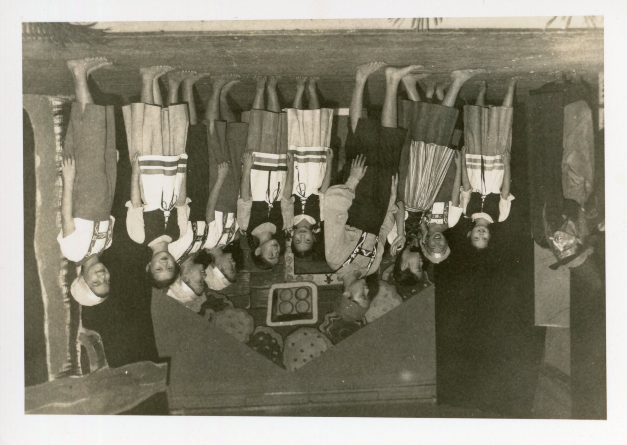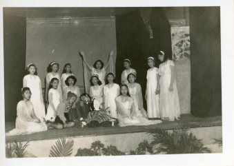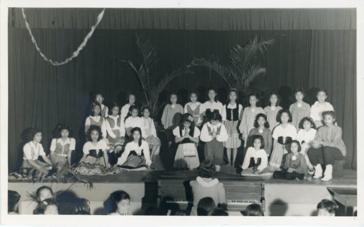 Students pose at their stage performance, 1946-1949.