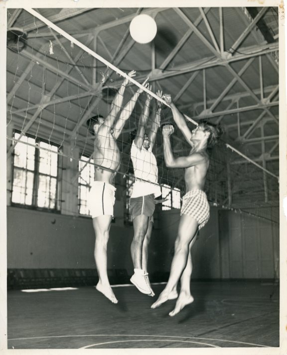 A man hits the ball over the net during a volleyball game at Palama Settlement gymnasium, 1960-1970. -