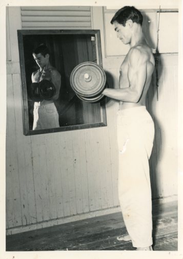 A male doing weight lifting training with a barbell, 1960-1970. -