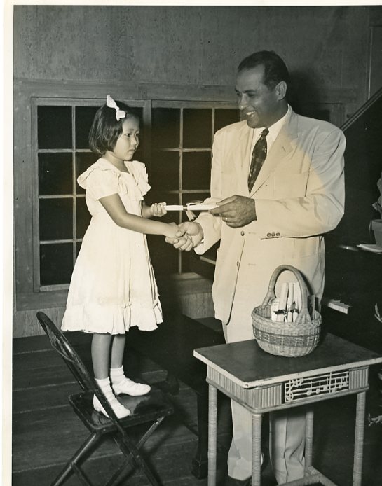 Palama Settlement's Executive Director Theodore Rhea hands awards to second year music school students, June 6, 1948, 2:30 p.m. Second year students - highest marks, completion of tests and classes and good attendance, passing piano test first time: Jane Chang, Jessie Chang, Anna Hasegawa, Leatrice Okazaki, Neil Shim, Cynthia Sugimoto.