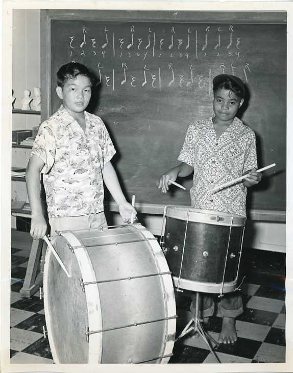 Lincoln Go (left) and Frank Medrano (right) play drums, July 27, 1951.
