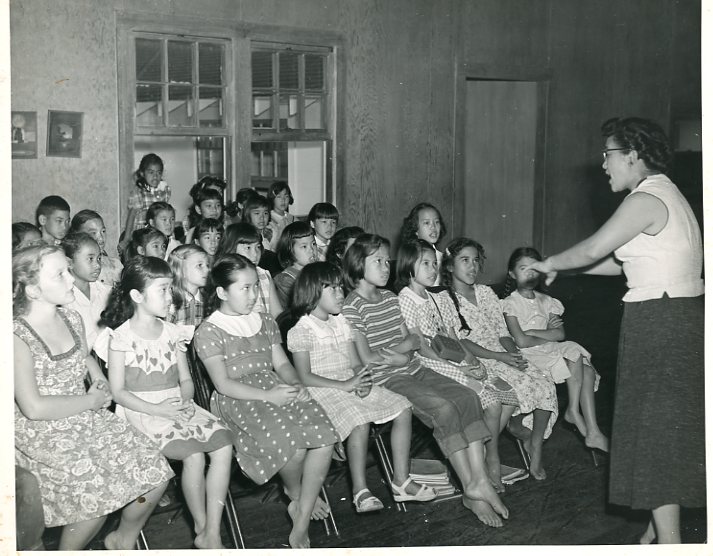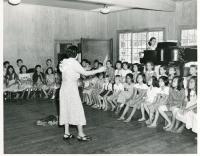 Keum Nyu Park leads the children's chorus at the Palama Settlement Music School, March 1954. -