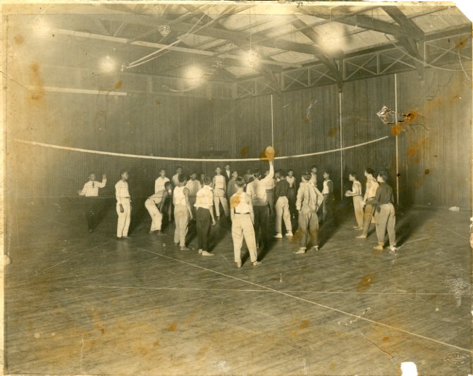 A group of boys hitting the ball during a volleyball game at Palama Settlement gym, 1920-1930. -