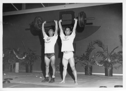 Elmer Tomita and another male lifting a barbell together, 1950-1960. Left: Elmer Tomita -